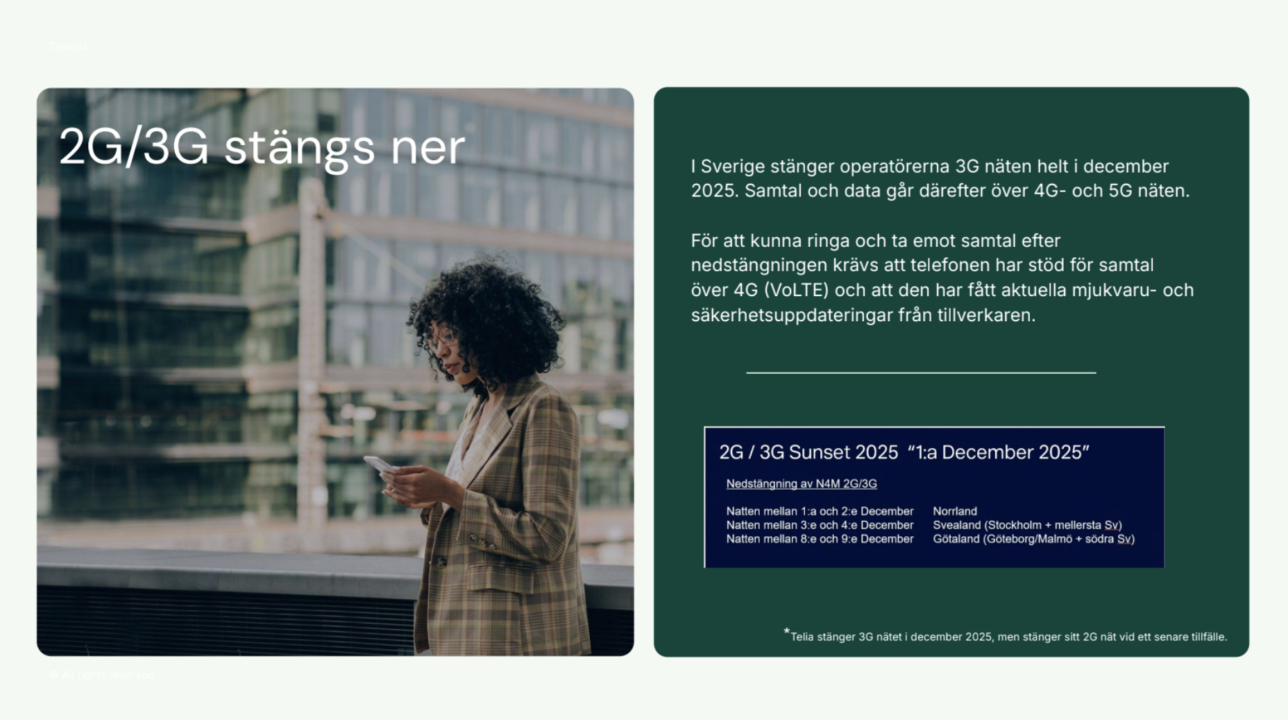 riskerar att inte kunna ringa vanliga samtal när 2G/3G väl är avstängt. Kunden kan fortfarande ha täckning för data, men röst samtalen upphör att fungera när näten släcks.