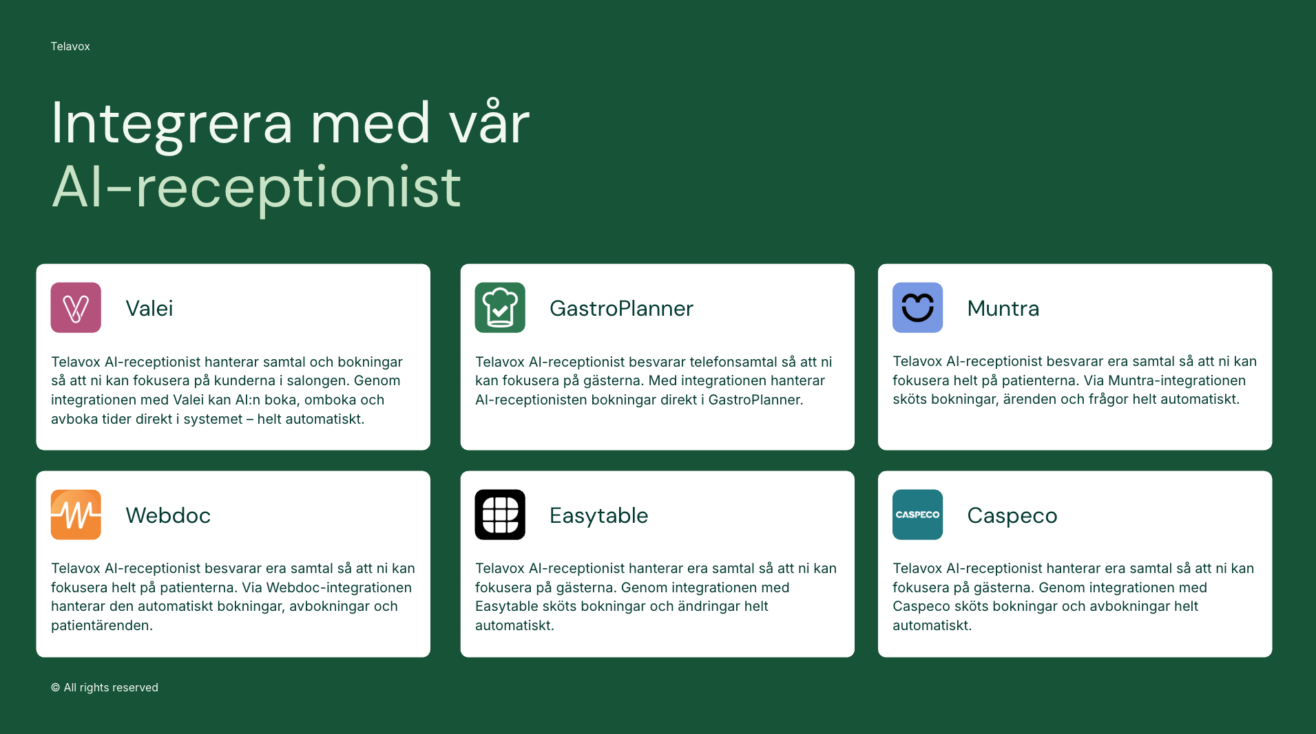 Nu börjar påsken verkligen närma sig och här kommer ett påskägg från oss med lite härliga nyheter. Vår AI‑receptionist blir ännu starkare, nu med nya integrationer mot branschledande boknings- och kassasystem. För er som partner betyder det fler relevanta branscher att sälja mot, tydligare affärscase och merförsäljning mot befintliga kunder.