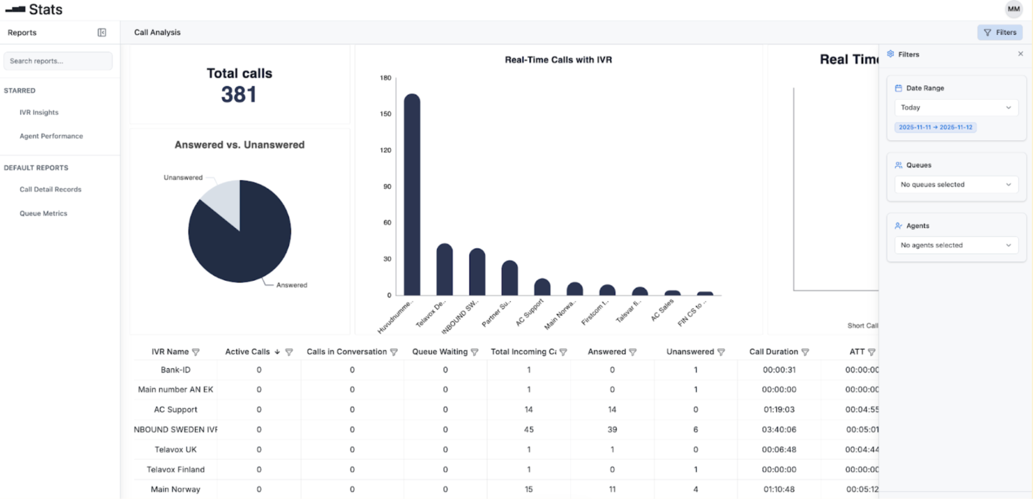 - Få realtidsinsikter om köer, belastning och pågående samtal.